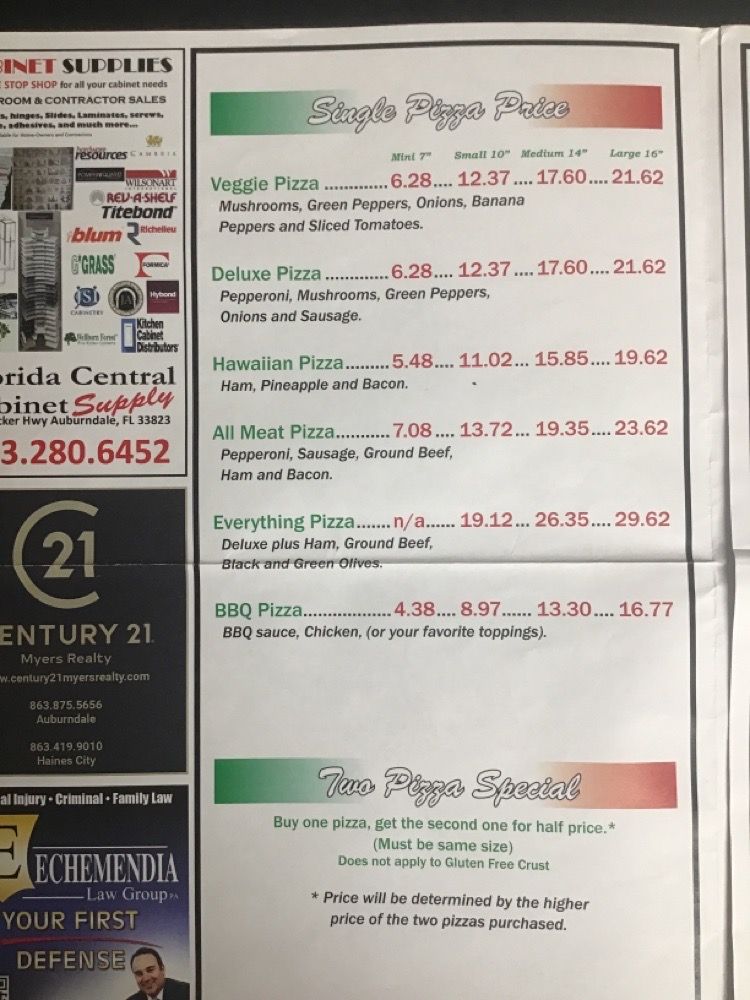 Located in Auburndale, Florida, Pizza Connection serves up delicious Italian pizza in a casual, family-friendly atmosphere. Known for their New York thin crust, the menu features specialty pizzas like the veggie pizza packed with mushrooms, green peppers, and banana peppers, and the hearty deluxe pizza loaded with pepperoni, sausage, and more. Prices are budget-friendly, starting at just $6.28.